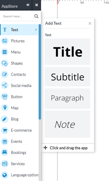 Adding text to your web site is very simple: click the text category in the Appstore on the left and then drag one of the formatting styles that are already preset for your web site in the work area.